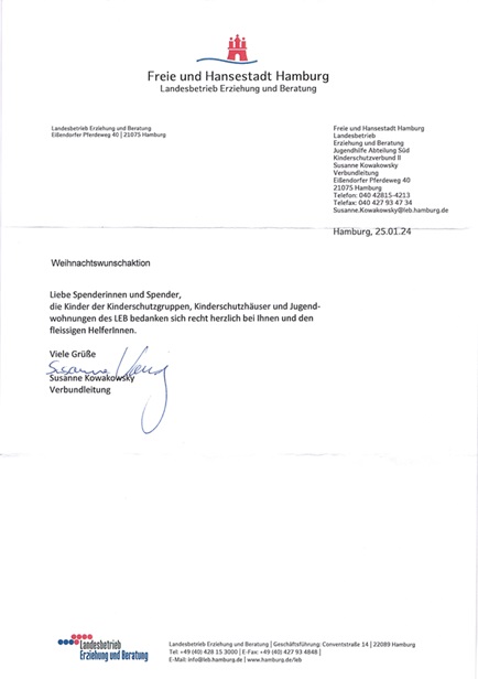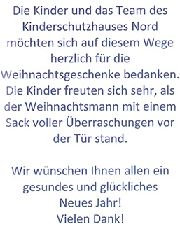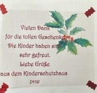 ich, meine Kolleg*innen und vor allem die Familien möchten sich für die tollen Weihnachtsgeschenke bedanken. Alle Geschenke sind so gut angekommen und die Kinder haben sich sehr gefreut. Gestern hat mich gerade wieder eine Mama angesprochen und meinte, dass ich auch ihren Dank an Sie weitertragen soll.