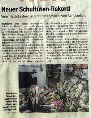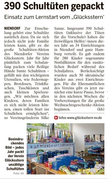 Dank der großzügigen Unterstützung des Vereins Kitz4Kids, des Spielwarengeschäftes Hartfelder im Tibargcenter und einer größeren Spende einer Niendorfer Familie konnten letztendlich 30 Schulgrundausstattungen/Schultüten für Schulanfänger aus sozial benachteiligten Familien zur Verfügung gestellt werden. Die Ausstattung enthielt alle für die Schule notwendigen Materialien, inklusive Brotdose, Trinkflasche und einer kleinen Federmappe. Vermittelt wurden die Familien über die Familienbildungsstätte Lurup, über Wellcome bzw. die Kaffeekanne Jenfeld, die Kita Dahlemer Ring in Jenfeld sowie dem Verein für Schwangere e. V. in Norddeutschland.